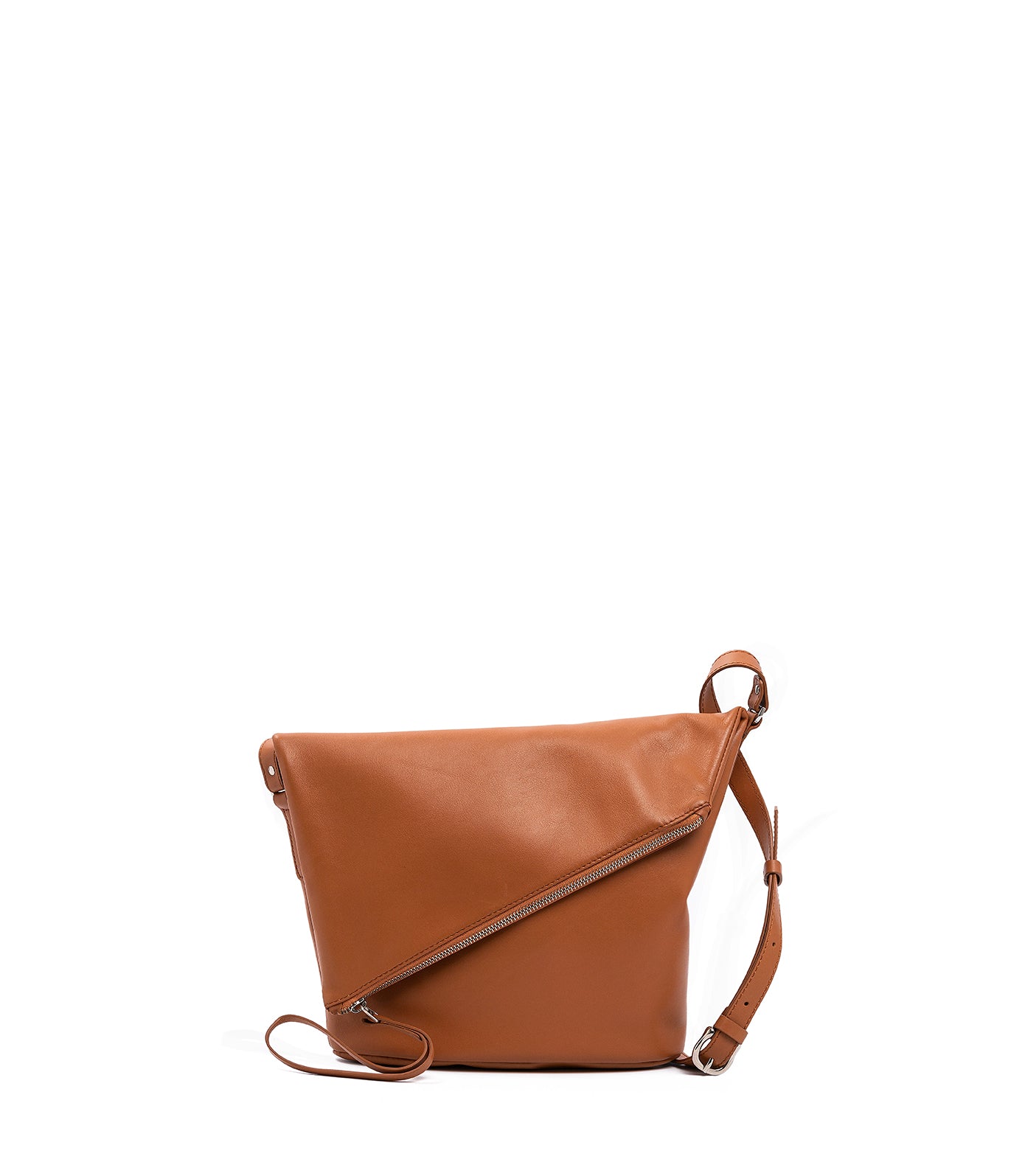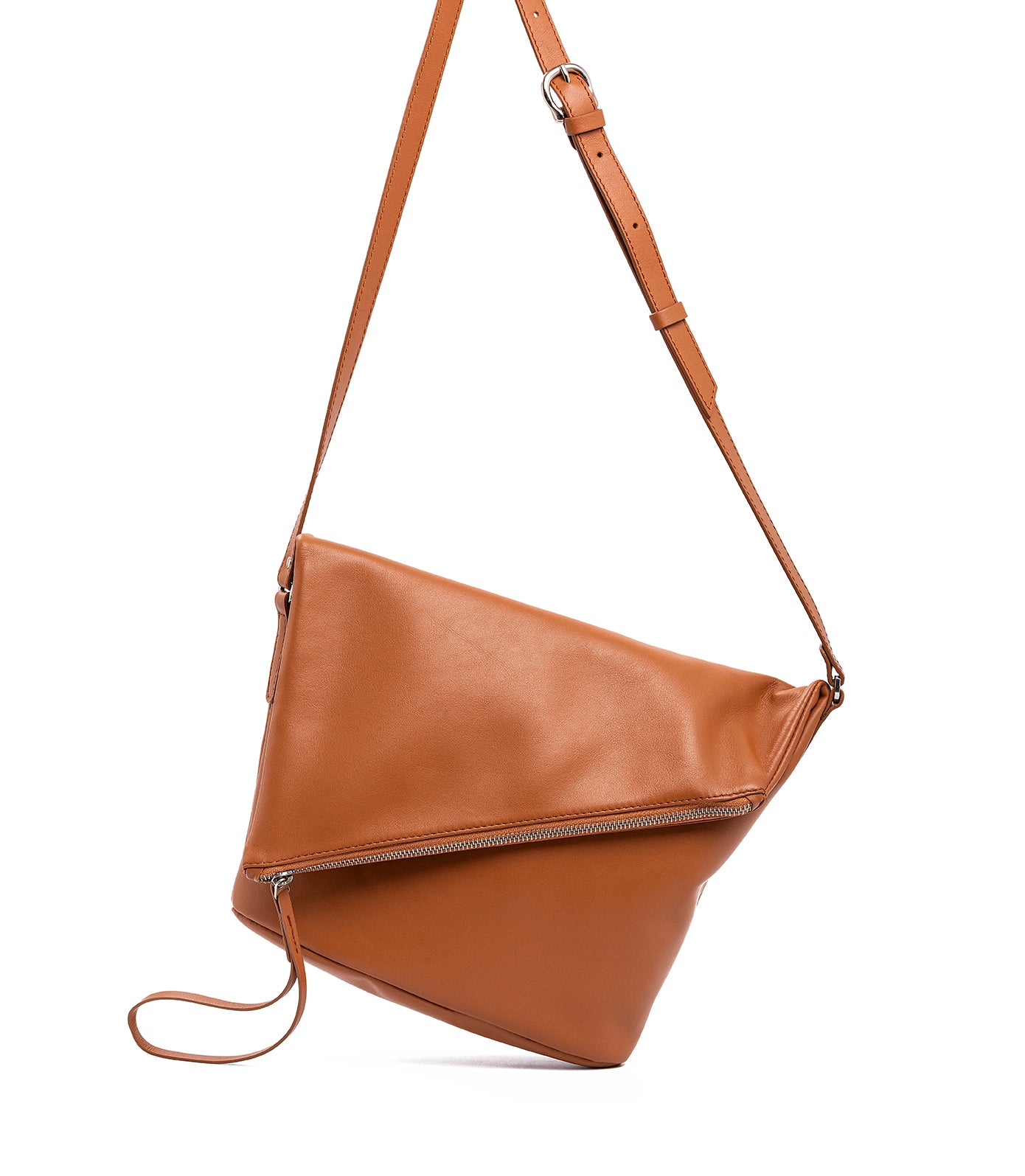 With a stylish diagonal fold-over flap, this crossbody bag is ideal for carrying all the necessities. The oval base provides extra volume. Zipper closure with a unique leather pull. The adjustable long strap allows it to be worn crossbody or over the shoulder. This bag is made of lightweight, flexible, high-quality cowhide leather and is available in various colors.
