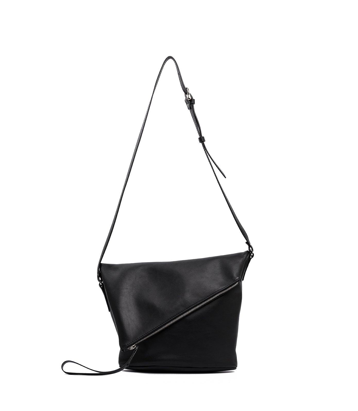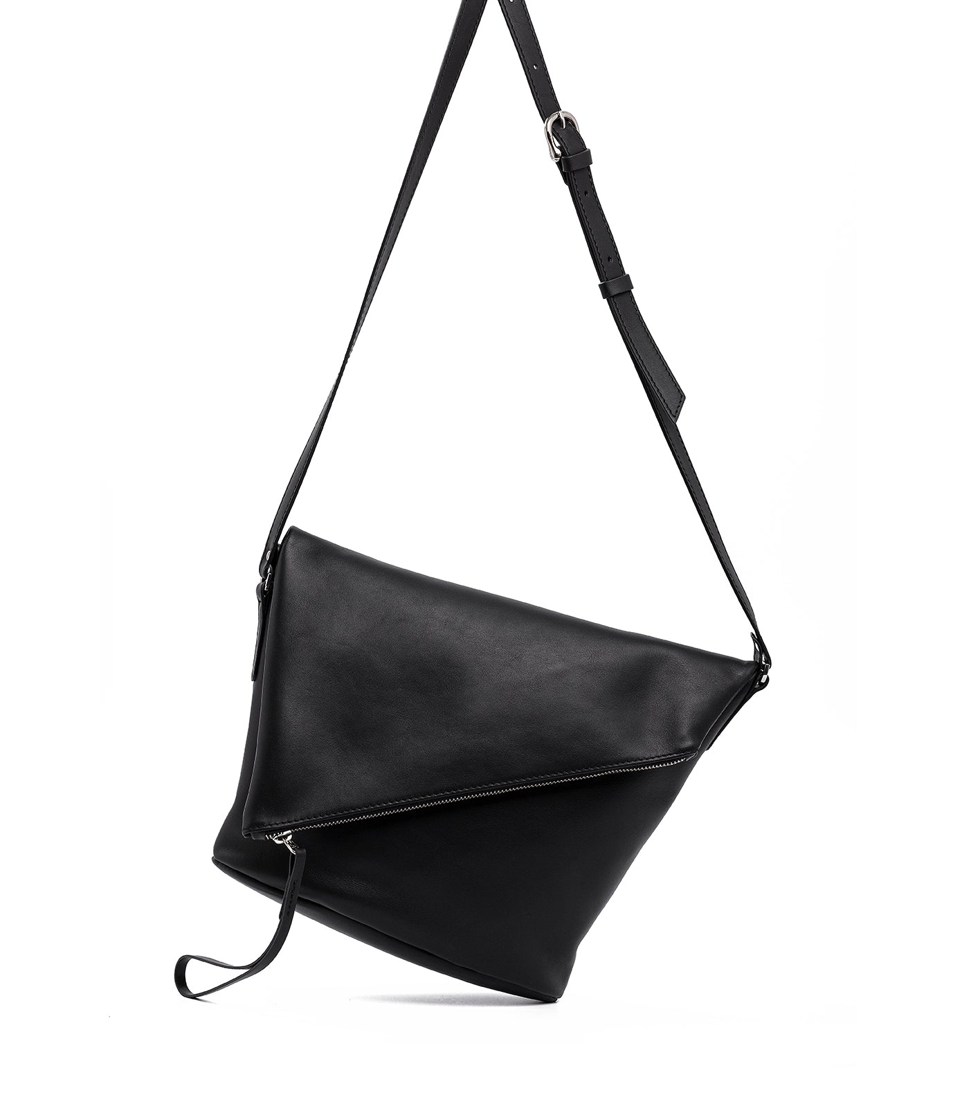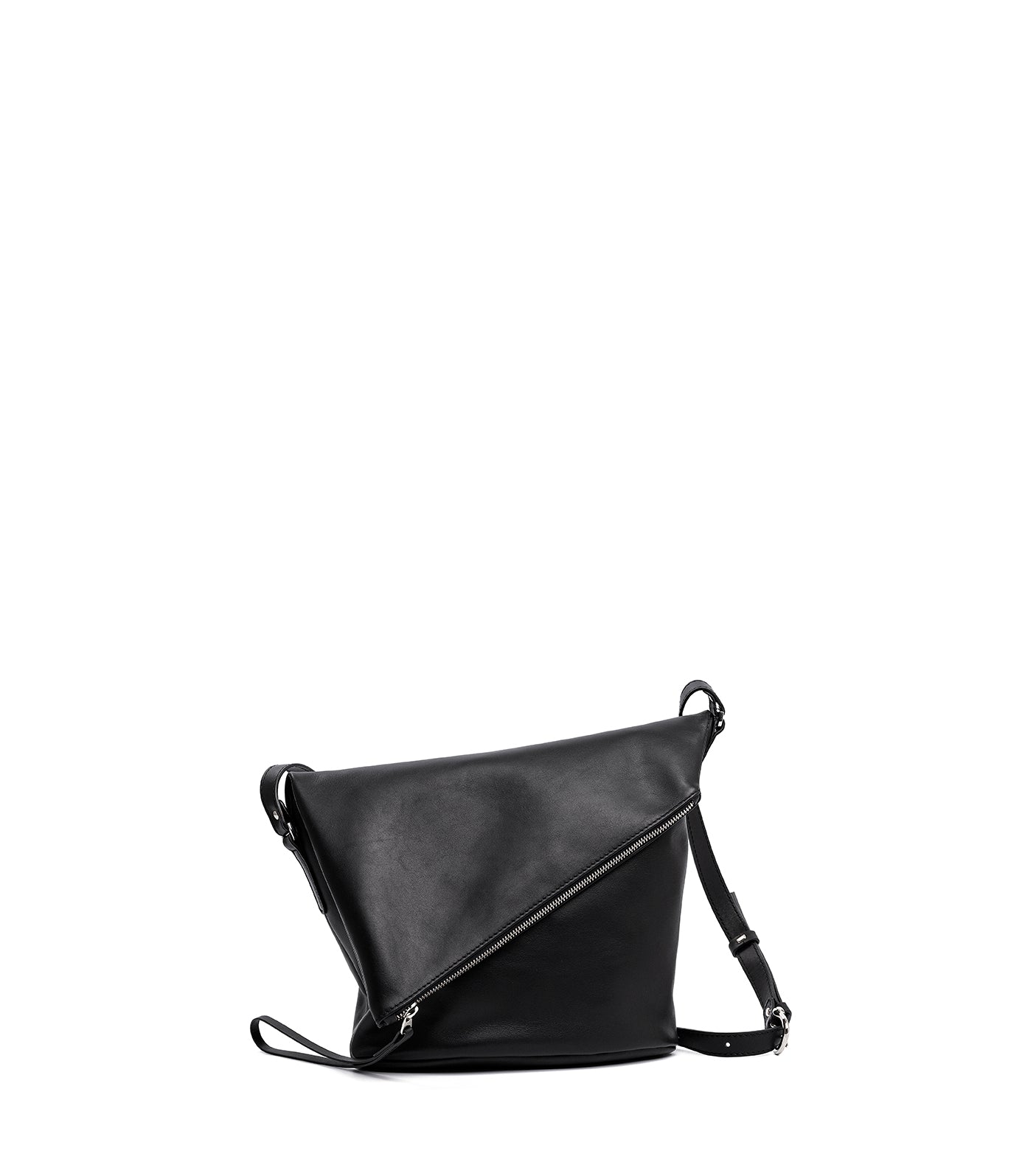 With a stylish diagonal fold-over flap, this crossbody bag is ideal for carrying all the necessities. The oval base provides extra volume. Zipper closure with a unique leather pull. The adjustable long strap allows it to be worn crossbody or over the shoulder. This bag is made of lightweight, flexible, high-quality cowhide leather and is available in various colors.